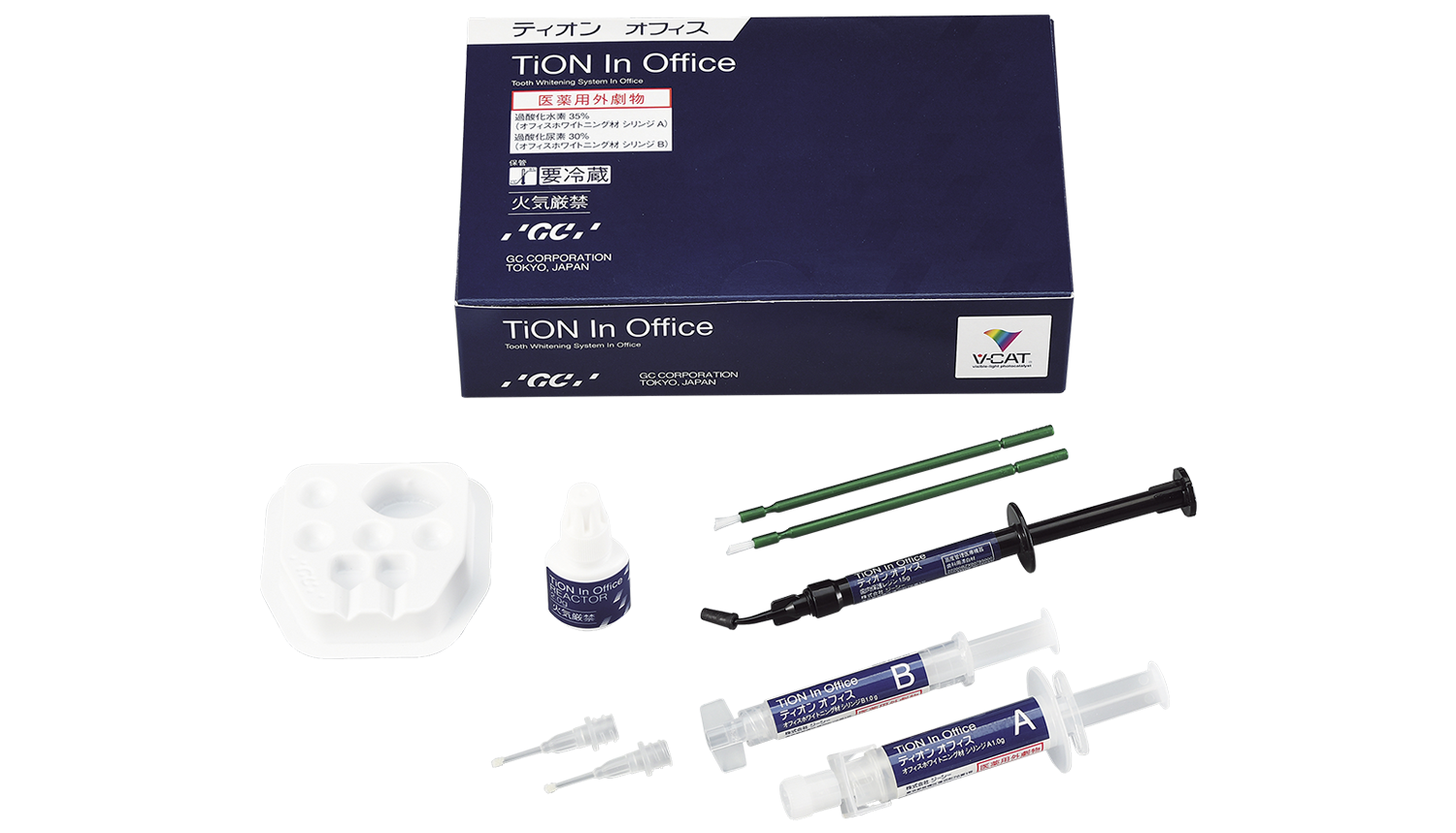 TiONオフィスは新技術「可視光応答型光触媒V-CAT」の応用により、比較的低い過酸化水素濃度での高いホワイトニング効果と低刺激性を両立させた新しい「日本製」のホワイトニング材です。